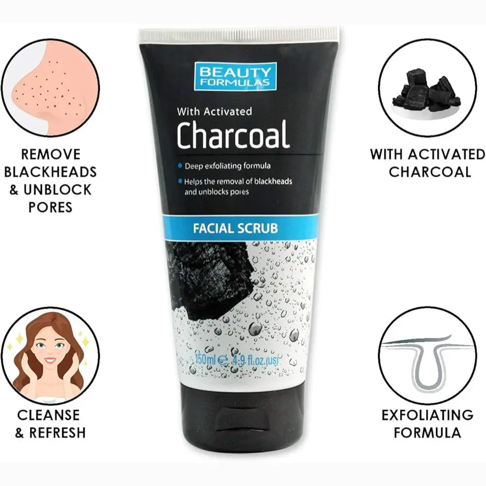 Beauty Formulas Activated Charcoal Facial Scrub 150ml - Deep-cleansing charcoal scrub to remove impurities, unclog pores, and refresh oily skin.