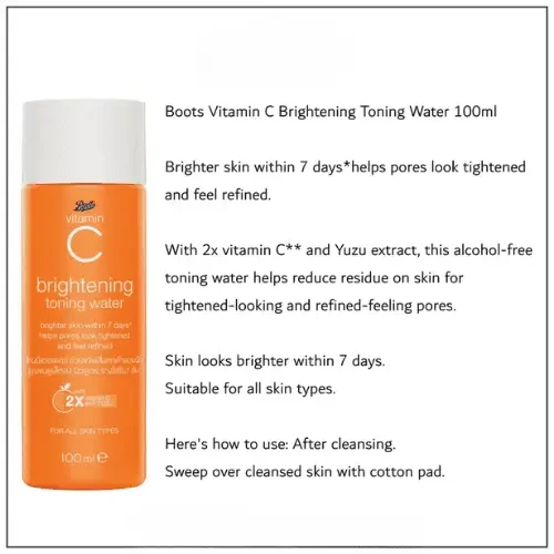 Boots Vitamin C Brightening Toning Water 100ml - Refreshes and brightens with gentle Vitamin C-rich toning water.