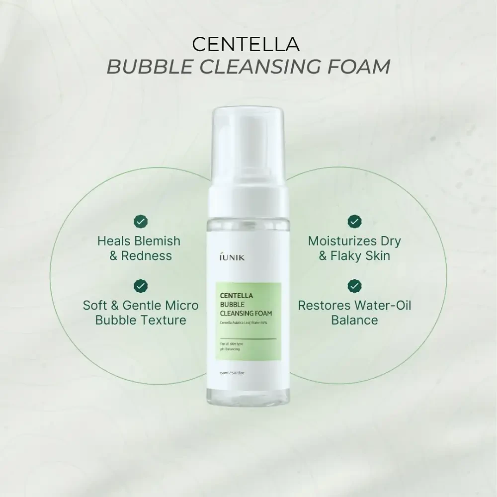 Iunik Centella Bubble Cleansing Foam 150ml - Gentle bubble foam cleanser with Centella Asiatica extract that soothes, purifies, and balances oily and sensitive skin.