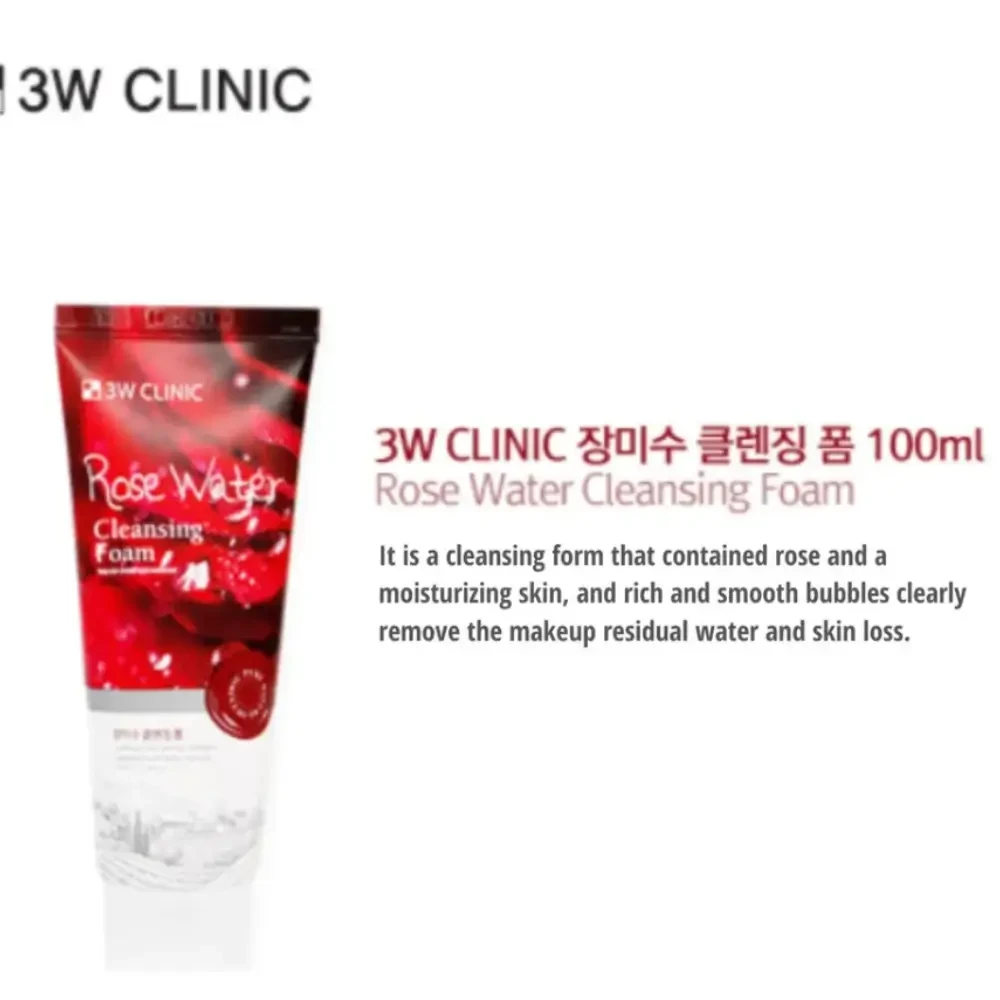 3W Clinic Rose Cleansing Foam 100ml - Gentle rose-infused foam cleanser that hydrates, soothes, and refreshes the skin while removing impurities.