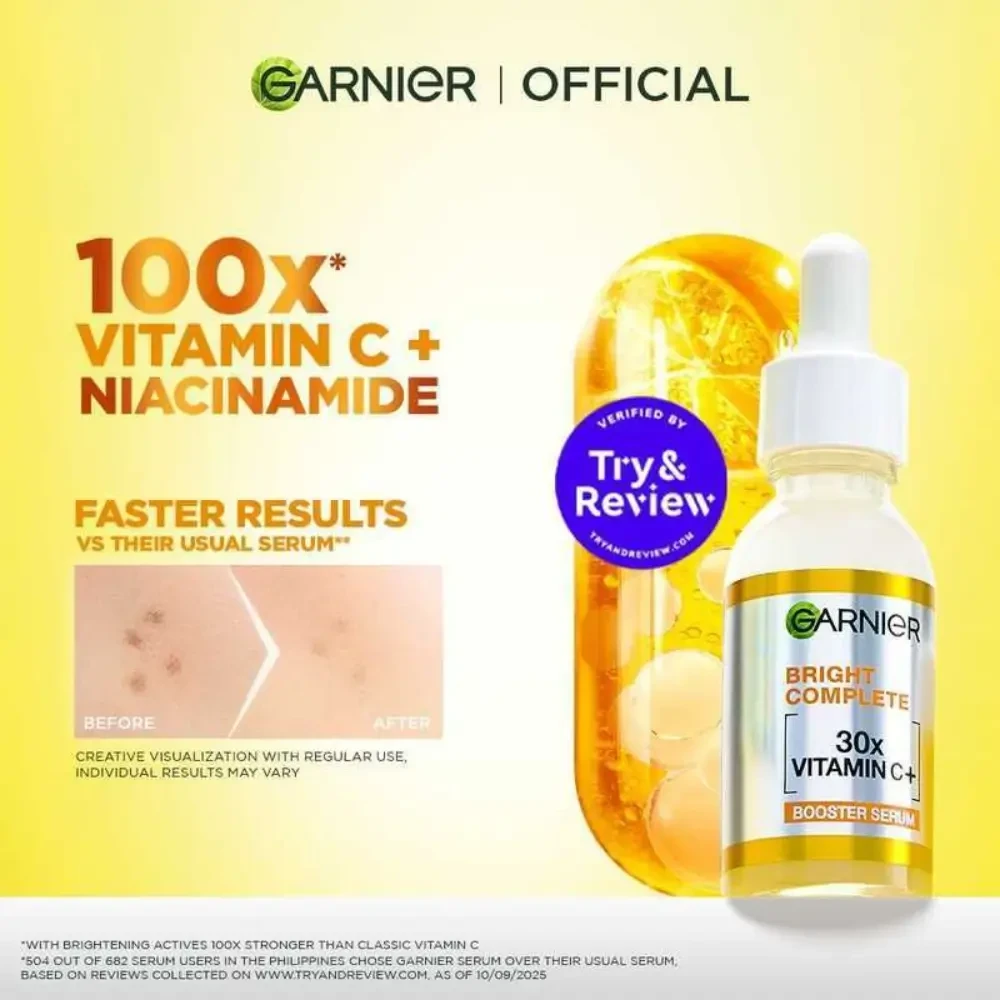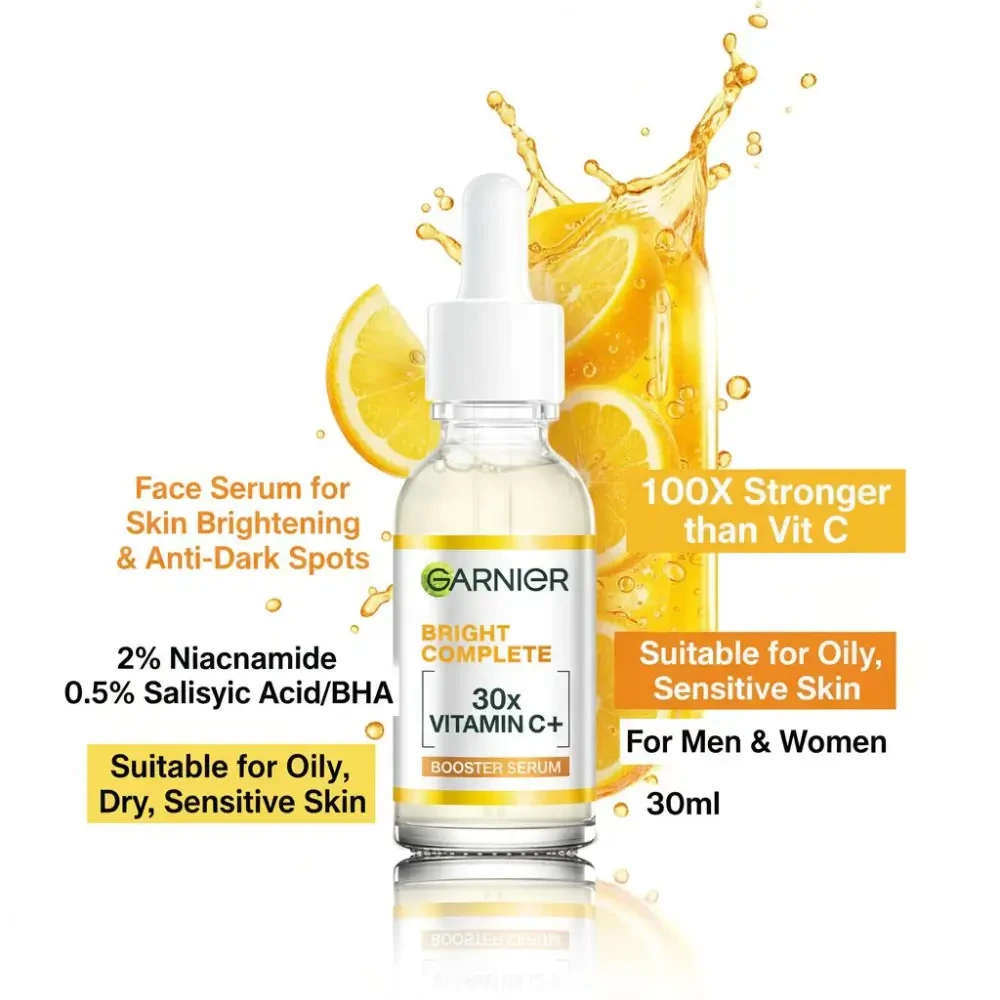 Garnier Bright Complete Vitamin C Serum 15ml - Vitamin C-powered brightening serum to reduce dark spots, even skin tone, and restore natural radiance.