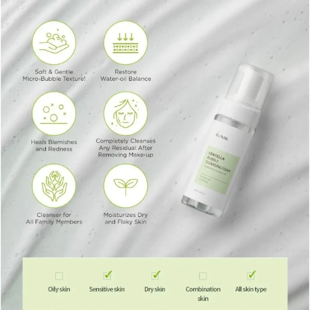 Iunik Centella Bubble Cleansing Foam 150ml is a mild foaming cleanser enriched