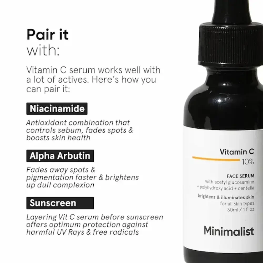 Minimalist Vitamin C 10% Face Serum 30ml is a lightweight, fast-absorbing serum