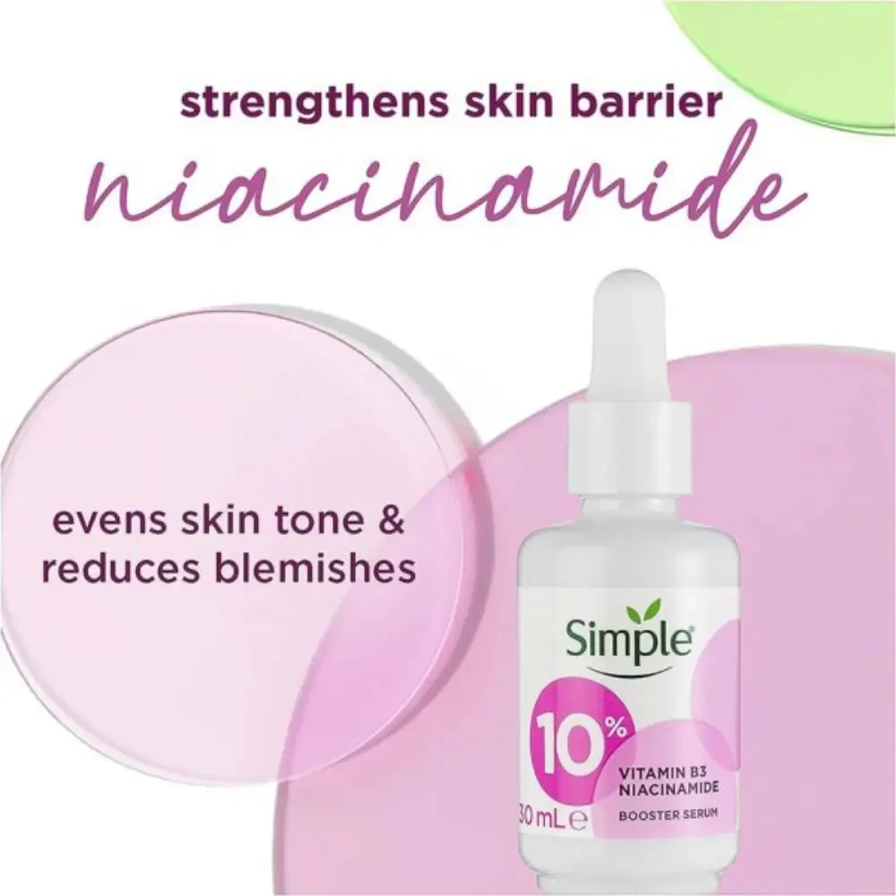 Simple 10% Niacinamide Vitamin B3 Booster Serum 30ml - Clarifying serum with 10% Niacinamide to reduce blemishes, control oil, and even skin tone for a healthy, balanced complexion.